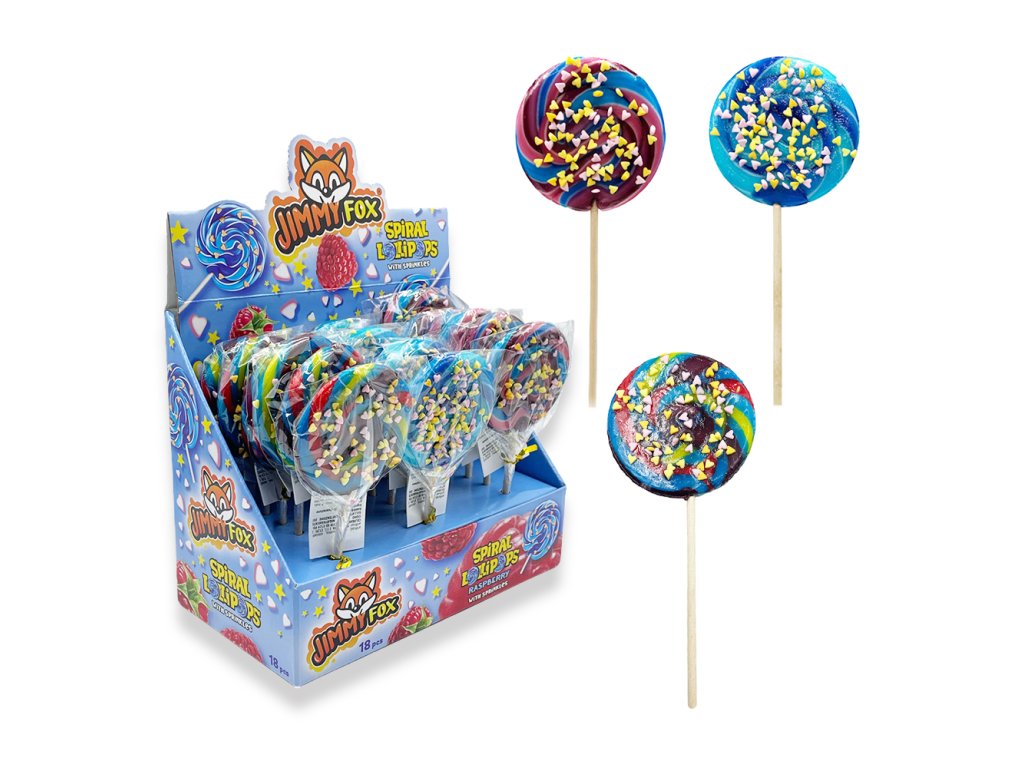 JIMMY FOX SPIRAL LOLLIPOPS RASPBERRY WITH SPRINKLES 50g